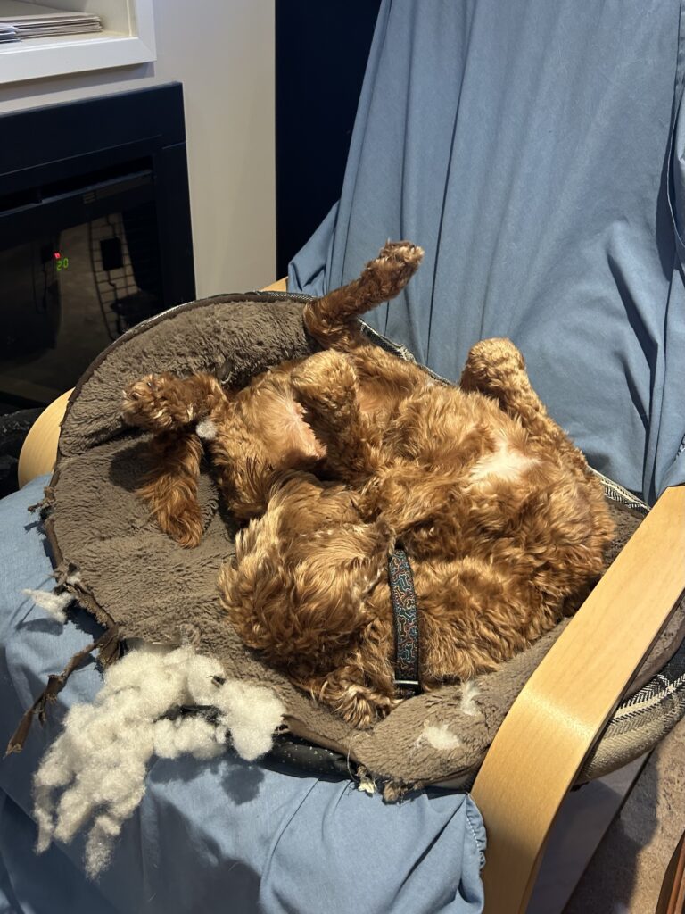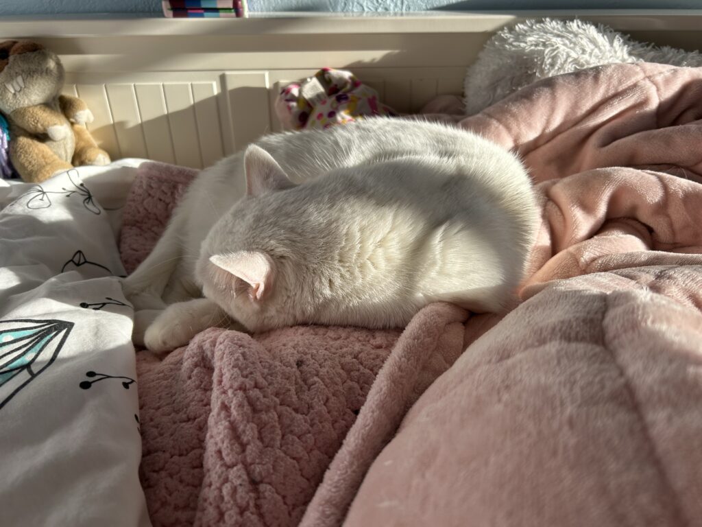 Jon Snow the Cat and Rusty the dog. Each sleeping soundly.